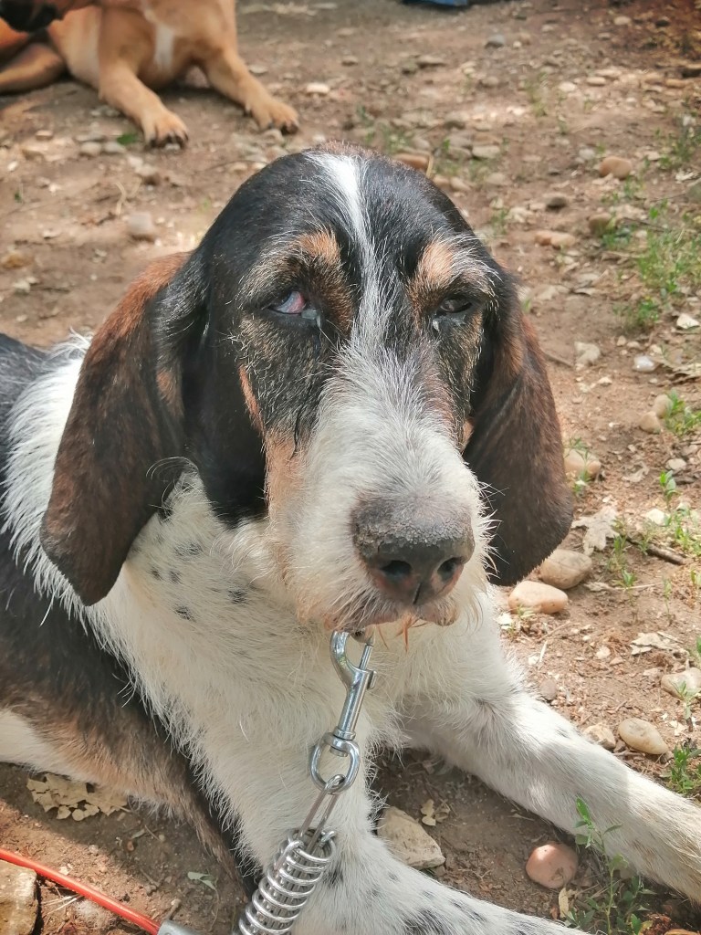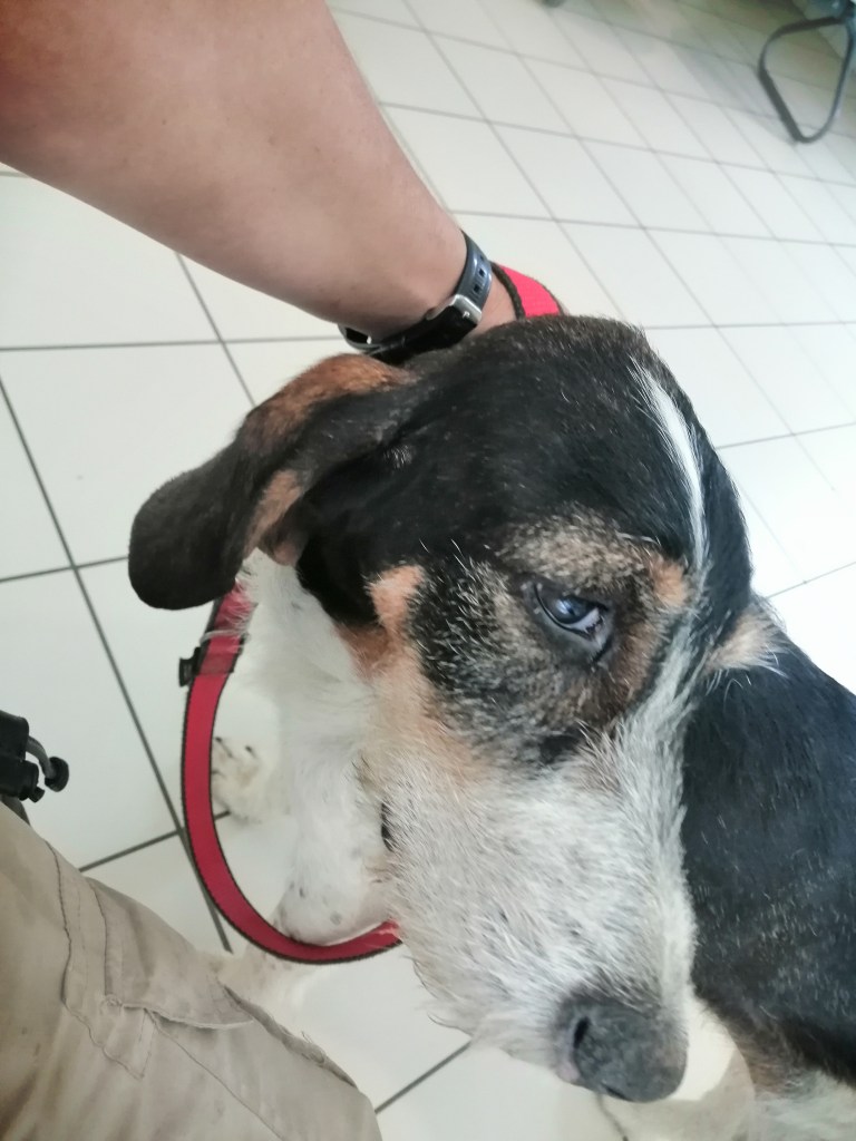 Lorsque nous l’avons attrapé, elle était épuisé, maigre, des épillets à l’intérieur des 2 yeux qui lui ont provoqué des ulcères que nous soignons actuellement. Elle a également dû recevoir 2 injections pour avorter, car bien sûr elle s’était faite prendre.